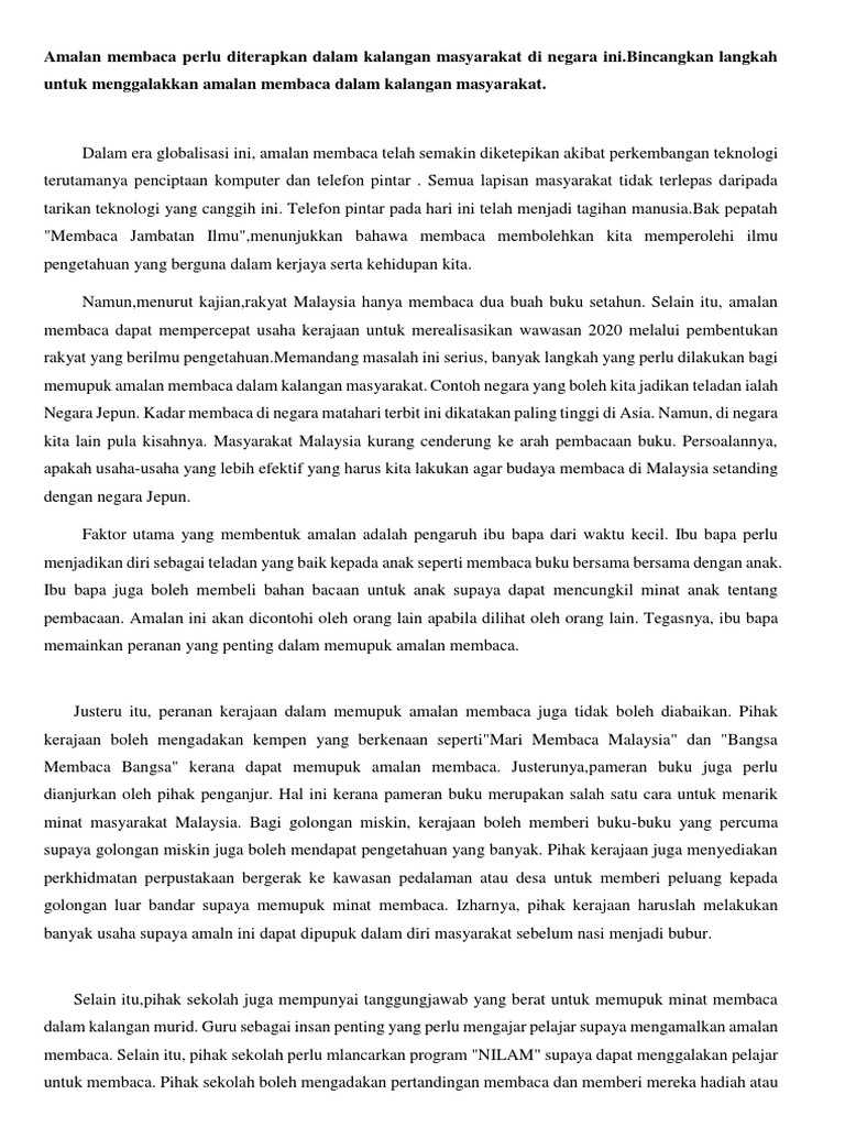 Berkunjung ke pameran dan pesta buku. Sesungguhnya amalan membaca mampu menambah pengetahuan kita. Sebenarnya, amalan membaca buku banyak membawa manfaat kepada pelajar. Oleh itu, membaca merupakan satu amalan yang perlu kita amalkan dalam kehidupan seharian. Jika anda terus komited dan berdisiplin, tidak mustahil amalan ini boleh diterapkan ke dalam kehidupan seharian anda. Terdapat pelbagai sebab mengapa amalan membaca ini belum lagi menjadi suatu budaya dalam kalangan terdapat pelbagai pihak yang perlu memainkan peranan penting dalam usaha memupuk minat kerajaan telah melaksanakan pelbagai langkah dalam usaha meningkatkan kesedaran. Puan che aisah binti ishak. Dalam abad ke 21 ini, amalan membaca telah semakin diabaikan disebabkan perkembangan teknologi terutamanya penciptaan komputer dan telefon. Memupuk amalan membaca juga bukanlah sesuatu yang sukar. Kondusif di rumah agar dapat memupuk motivasi membaca dan sikap yang positif dalam kalangan. Langkah mundur ke belakang seumpama itu hanya mengumpan masyarakat untuk menjadi warga hedonistik yang pada. Jelaskan peranan pelbagai pihak untuk memupuk amalan membaca dalam kalangan. Kewajipan membaca bukan sekadar menjadi pelengkap kepada sesuatu peperiksaan, sebaliknya menjadi tanggungjawab untuk melahirkan umat yang berjaya, bijaksana, dan hebat menguasai dunia keilmuan.