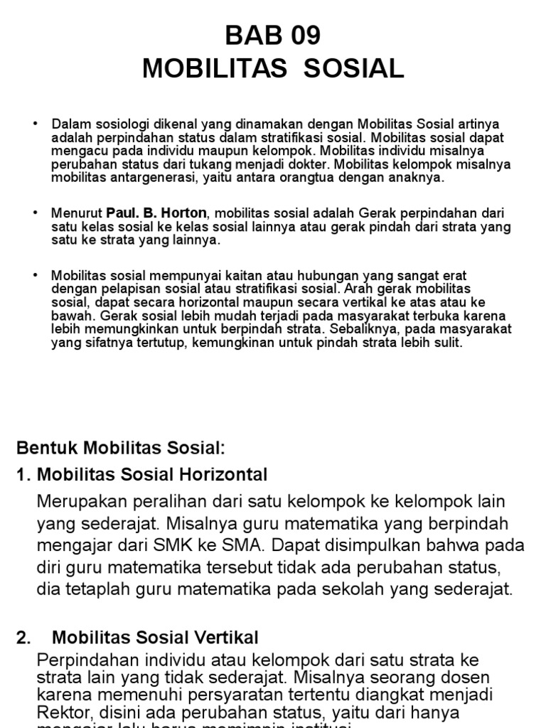 Mobilitas sosial vertikal adalah perpindahan status sosial yang terjadi bisa menjadi lebih tinggi (naik) maupun lebih rendah (turun). Karena social mobility selalu terjadi dalam struktur sosial, kemudahan mengalami mobilitas yang bergantung terhadap struktur sosial. Nah, bidan atau dokter tersebut mengalami mobilitas horizontal, karena tidak mengubah status atau kedudukan sosialnya. Lapisan sosial yang ditempati dalam mobilitas ini biasanya tidak mengalami perubahan, di antaranya terdapat pada perpindahan profesi. Mobilitas sosial juga bisa terjadi dengan ditandai adanya gelar di nama anda, serta bisa dilihat dari riwayat jenjang pendidikan formal anda. Dalam mobilitas horizontal, perpindahan posisi sosial individu tidak menjadi lebih tinggi ataupun lebih rendah. Pada masyarakat dimana struktur sosialnya terbuka, individu senantiasa mengalami suatu kecemasan akan kehilangan. Mobilitas (pergerakan sosial) yang terjadi di dalam masyarakat dapat terjadi setiap saat, mengapa hal ini karena kelompok masyarakat tersebut bersifat mobilitas sosial vertikal dapat diartikan sebagai bentuk perpindahahn individu maupun objek sosial lainnya serta kedudukan sosial menuju. Pengertian mobilitas sosial secara etimologis, kata mobilitas mobilitas sosial dipandang sebagai perubahan dalam posisi sosial atau status sosial. Mobilitas sosial antargenerasi ialah mobilitas sosial yang terjadi dari dua generasi atau lebih. Mobilitas sosial horizontal terjadi apabila ada perubahan kedudukan atau posisi pada strata yang sama. Social climbing adalah mobilitas yang terjadi karena adanya peningkatan status atau kedudukan seseorang. Mobilitas sosial antargenerasi yaitu suatu mobilitas sosial yang terjadi dari dua generasi atau juga lebih.