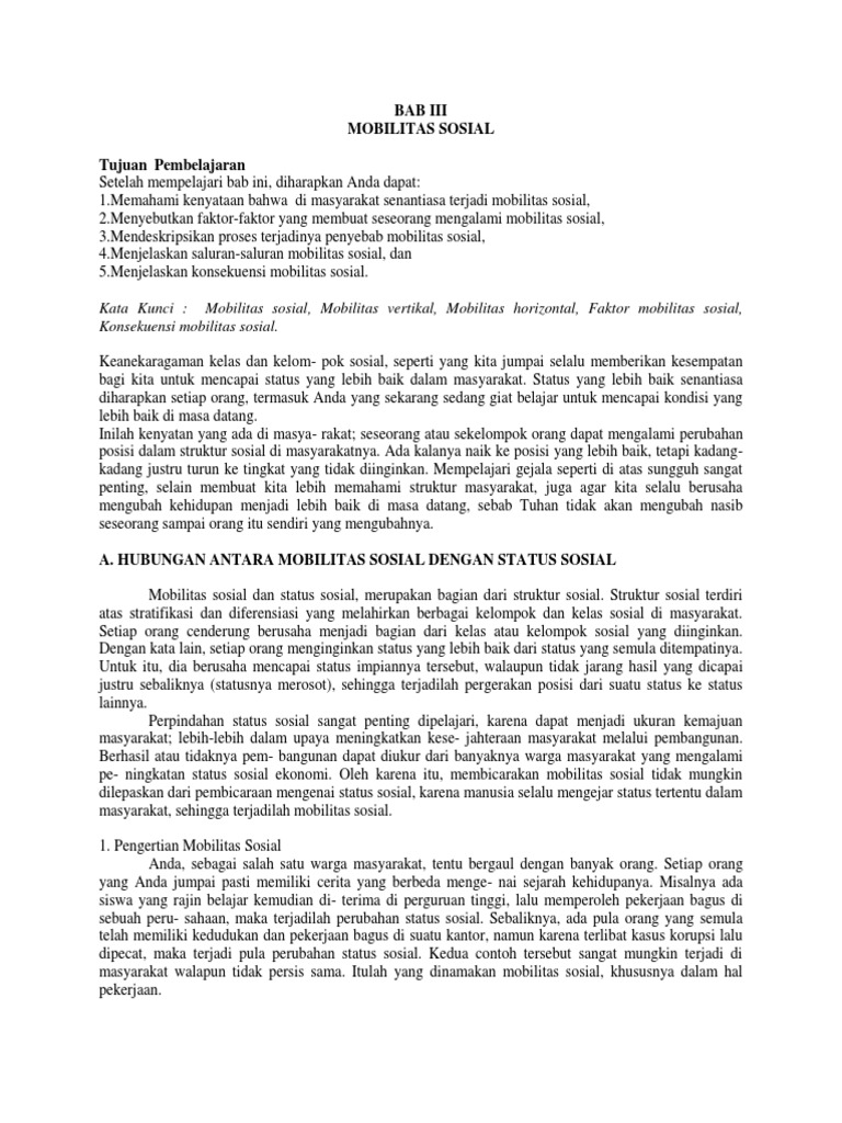Mobilitas sosial lebih mungkin terjadi pada masyarakat. Seorang guru di sebuah sma di kota a kemudian pindah ke sma di kota b. Mobilitas sosial vertikal adalah perpindahan status sosial yang terjadi bisa menjadi lebih tinggi (naik) maupun lebih rendah (turun). Pengertian mobilitas sosial secara etimologis, kata mobilitas mobilitas sosial dipandang sebagai perubahan dalam posisi sosial atau status sosial. Guru tersebut tidak akan mengalami perubahan kedudukan serta peran, namun hanya berpindah tempat.
