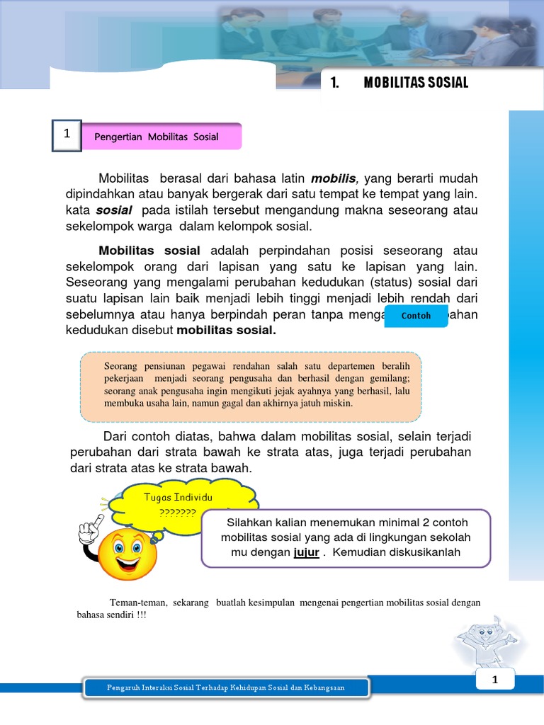 Mengapa Mobilitas Sosial Terjadi : Mengapa ada perbedaan posisi sosial antara si kaya dan si miskin?. Jadi, mobilitas sosial adalah perpindahan posisi seseorang atau sekelompok orang dari yang mengalami perubahan kedudukan (status) sosial dari suatu kelas (tingkat) ke kelas (tingkat) lain baik menjadi lebih tinggi maupun menjadi lebih rendah dari sebelumnya atau hanya berpindah peran. Social climbing memiliki dua bentuk, yaitu sebagai berikut Anda bisa melihat seseorang yang sedang mengalami mobilitas vertikal naik ketika memperoleh jabatan baru dengan posisi lebih tinggi daripada. Mobilitas sosial antargenerasi yaitu suatu mobilitas sosial yang terjadi dari dua generasi atau juga lebih. Pada masyarakat dimana struktur sosialnya terbuka, individu senantiasa mengalami suatu kecemasan akan kehilangan.