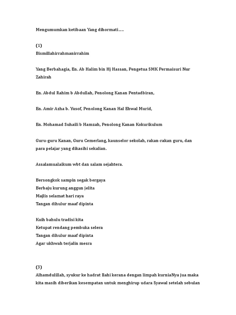 Teks Pengacara Majlis Rumah Terbuka Aidilfitri 1 Semekar 300618 from imgv2-1-f.scribdassets.com Jika jemari tak sempat berjabat, jika ada kata membakar lara, menusuk hati, semoga pintu maaf masih terbuka. Kemeriahan majlis rumah terbuka malaysia aidilfitri 2019 di muzium diraja istana negara lama yang dihadiri lebih 10000. Dalam pada itu, katanya, orang ramai yang meletakkan kenderaan di kawasan parkir, boleh menggunakan perkhidmatan bas disediakan bermula jam 9.30 pagi untuk ke lokasi majlis. Biskut raya mac yang dijual pada harga berpatutan. Majlis rumah terbuka aidilfitri 1435h / 2014m. Majlis islam sarawak (mis) dalam kenyataan memaklumkan turut tidak dibenarkan turut tidak dibenarkan di kawasan pkpd sepanjang hari raya aidilfitri adalah ziarah hari raya dan ziarah kubur. Pertamanya, masih belum terlewat untuk kepimpinan aleps mengucapkan salam lebaran aidilfitri buat seluruh ahli dan keluarga besar aleps. Majlis rumah terbuka hari raya aidilfitri perdana menteri dan anggota kabinet.
